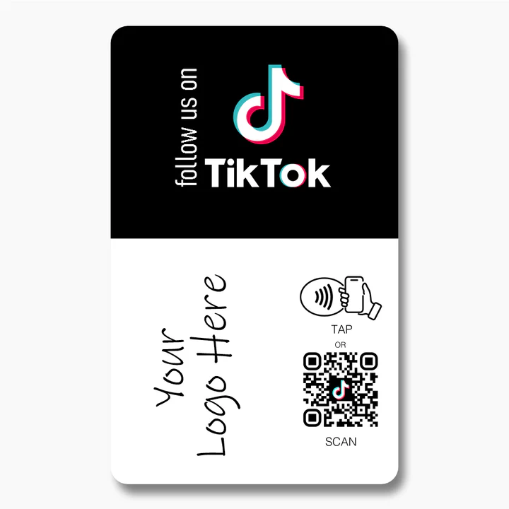 Featuring a QR code and your logo, this pre-programmed card seamlessly connects to your Tik Tok page opening it in the mobile app. Your customers can effortlessly tap or scan the card, opening a direct link and follow you instantly.
